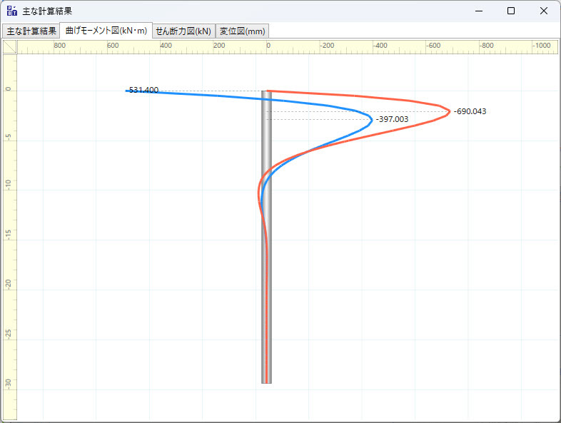 たわみ曲線法により矢板壁の計算を行います。必要根入れ先端高および断面力を算定します。 曲げモーメント図および変位図の作図機能あり。また,矢板壁の断面性能を入力することに より地上部および地中部の応力度を算定します。